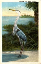 Great Blue Heron Bird Linen Era Postcard c. 1930s-50s Florida Wetlands |