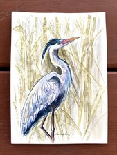 Original Blue Heron Gouache Painting by Alannah Dyer- Art 5x7 in Color Pencil